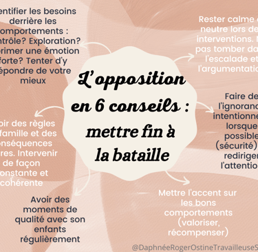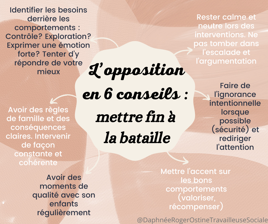 Certains enfants vivent aussi des émotions fortes qu’ils n’arrivent pas à gérer seul et l’opposition devient leur mécanisme maladroit afin d’alerter leur parent et communiquer qu’ils ont besoin de leur soutien face à une souffrance. Dans certains cas, si la souffrance est trop grande ou le parent démuni, cela peut s’avérer pertinent de consulter un professionnel.